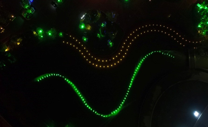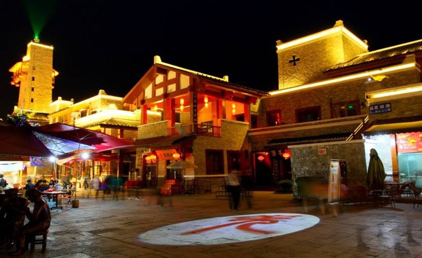街区建筑物在房檐上设置RGB广角小射灯,墙体中部配装壁灯,顶部为LED洗墙灯,完整的勾勒出建筑物整体轮廓。建筑物瓦面的处理,仅采用硬条灯打亮屋脊的造型,压低屋面整体亮度,明暗对比形成内敛的神秘感。小投影灯在地面上投出羌族文化特色的图案,小巧而精致,别有一番趣味