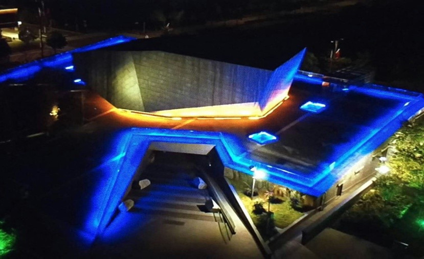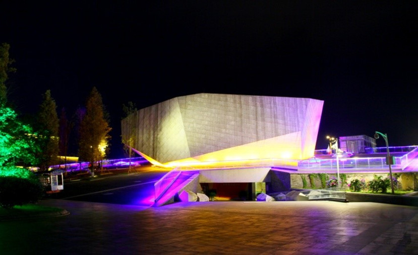 幸福馆以羌族所崇拜的白石为主题。护栏中嵌入的线条灯采用密集小功率灯珠和小角度透镜,透过玻璃围栏照射到下方不锈钢底座上,线条灯反射出蓝宝石的效果,达到见光不见灯的效果。同时在原有蓝宝石造型的玻璃天台中加入特定波长的蓝色光源,让出光效果更为接近宝石蓝,成为幸福馆的一大亮点。