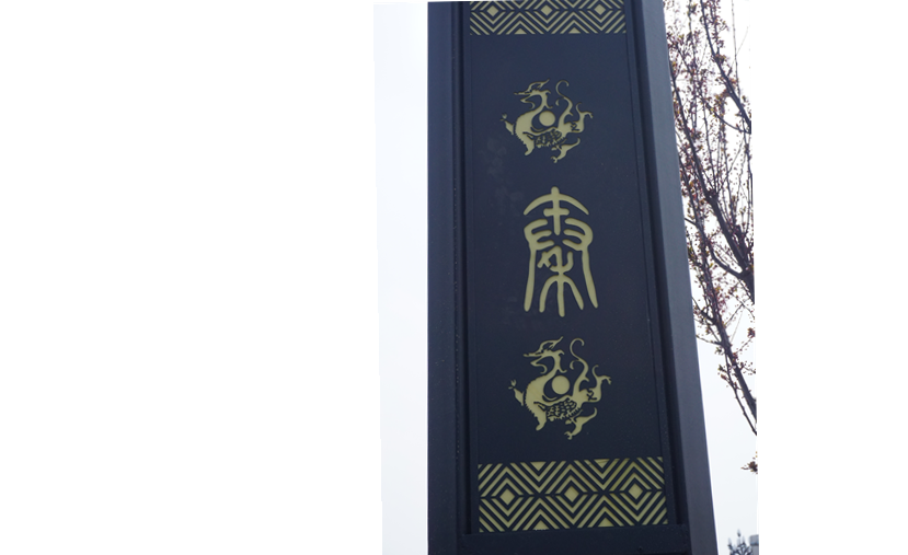 灯杆底座刻有篆体“秦”“汉”的字样,上下图案为秦汉时期瓦当四神兽图案,上下条纹为秦砖图案提炼而来。