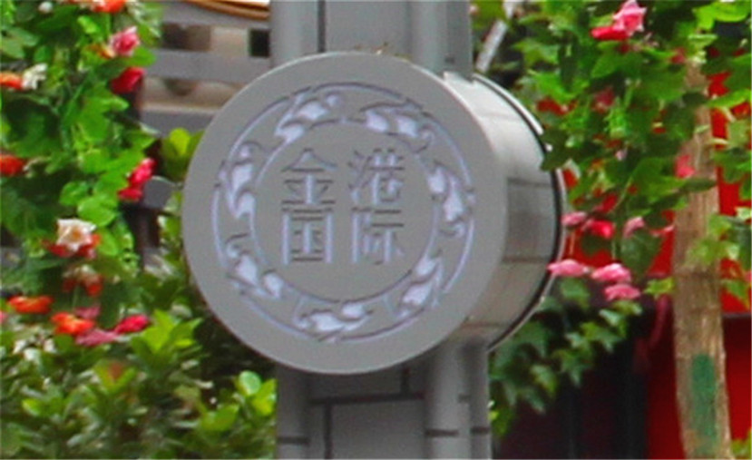 “民国风情”灯外观色彩呈铁灰色,灯杆使用青砖纹饰,展现出民国时期建筑特点,给人以素雅、沉稳,古朴的美感。三个灯头采用西方庭院灯的马灯造型,以显示当时社会的开放性。灯臂采用中国传统的祥云纹饰,“祥云”文化概念在中国具有上千年的时间跨度,用于此处使其更具年代感。灯杆中下部的铜质雕刻“金港国际”字样,与地方方位名称相得益彰,是整灯的点睛之处。