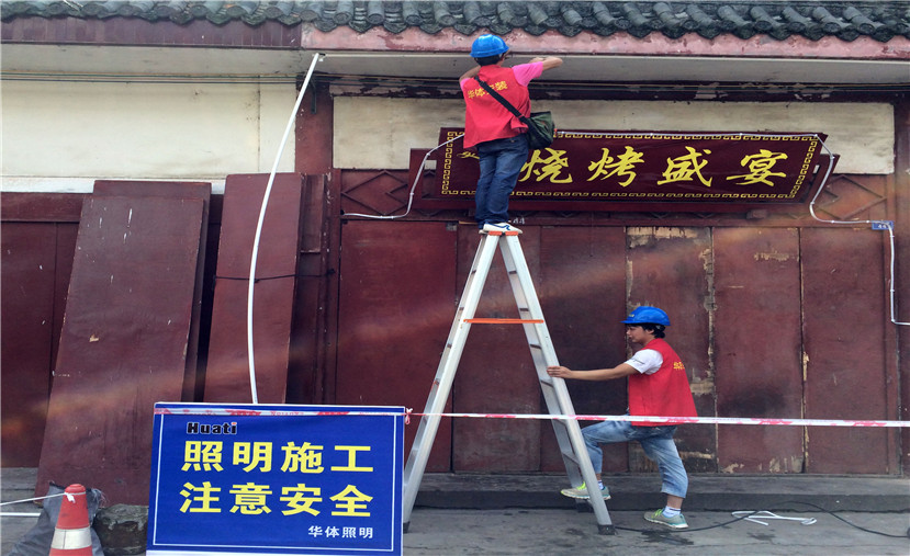 此次安装工程时间紧、任务重,特别是天气炎热的夏天,是黄龙溪古镇的旅游旺季,人流量特别大,为了不影响景区正常运营,华体照明安装队伍选择早上六点到十点和下午六点到晚上十点两个时间段错峰施工。