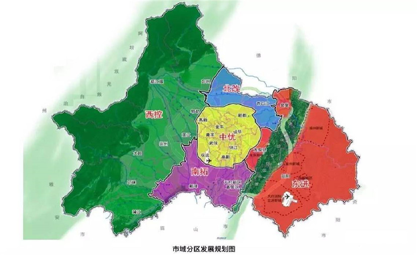 2017年4月,在中国共产党成都市第十三次党代会上,成都市委书记范锐平正式提出“东进、南拓、西控、北改、中优”发展战略,成都的城市布局由原来的“两山夹一城”转变为“一山连两翼”,以龙泉山为界,西边为中心城区,东边则将塑造全新的东部产业新城——东部城市新区。