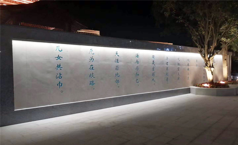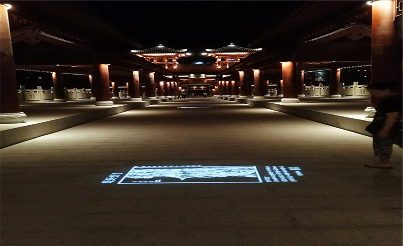 在景观亭顶部照明及风雨廊顶部照明的光环境下,华体结合地面原有文化浮雕,采用灯光投影的方式,将新津十二景的一笔一划投射到地面,通过一桥,看遍新津十二景。