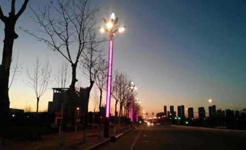 科技大道,位于烟台高新区,是烟台“智慧城市”的试点区域。2015年底,春意盎然的到来为整个园区增添无限生机和活力。它寓意春季万物复苏,百花齐放,城市的经济蒸蒸日上。春意盎然高15米,主要是通过花卉造型进行抽象设计而来。灯杆中部加装LED氛围光带,使夜间照明更加绚丽;灯体内部安装智能控制系统,使照明高效节能、绿色环保,另外灯杆上安装摄像头,为路灯装上“眼睛”,实现了多平台的交互运用