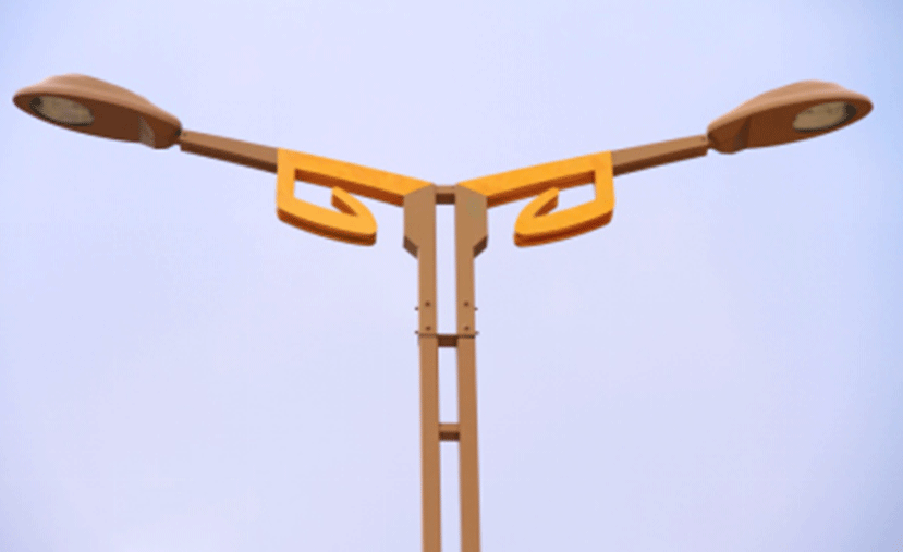 2014年,华体照明承接了广元市区瓷莲路蜀纹灯100盏。蜀纹灯,灯高12米,设计灵感源于古蜀文化中的青铜元素,双臂造型,金色与黄色的衔接自然而美观。杆体采用两根矩杆连接而成,镂空而通透。
