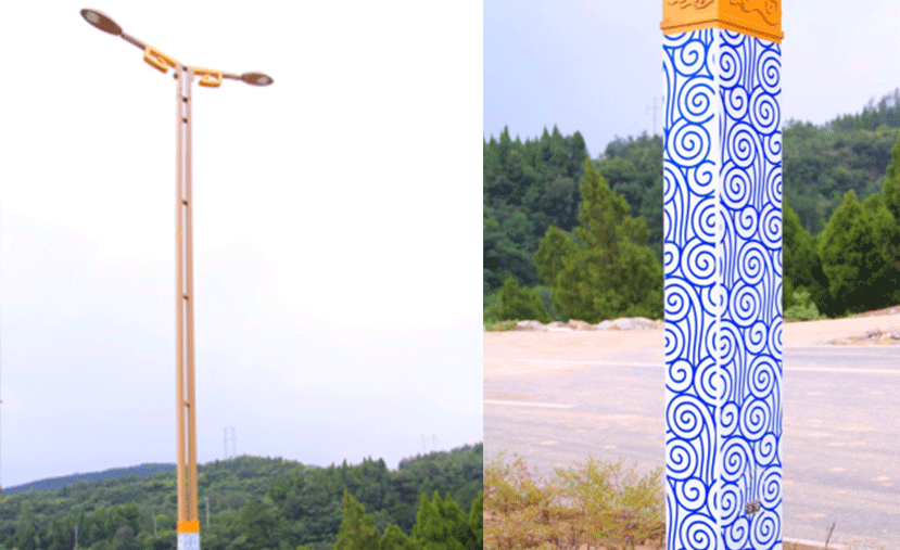 该款灯底座将带有中国元素的祥云纹运用于灯具上,呈现蓝白色相间,极具“中国风”特色,寓意祥瑞、民安。灯杆与底座的连接部分,金色的卷云纹熠熠生辉,与底座的蓝色对比鲜明,让人眼前一亮。瓷莲路完善了城市北环线,而蜀纹灯则如忠诚的卫士,排列有序,在迎接八面来宾的路上,诉说着广元市古朴浓厚的历史文化。