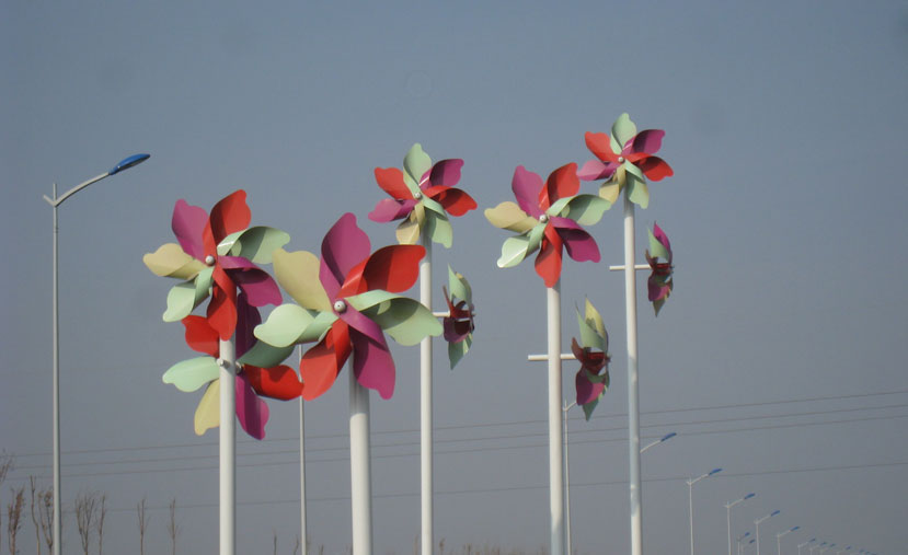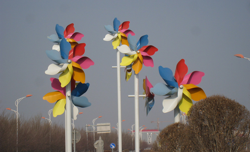 该景观风车由黄、绿、蓝、红、紫、灰等多彩颜色组成,风车直径为1.6米。每柱高度为4米至8米不等,由低到高分布,赋予时尚感。独特的白色灯杆两侧,由两个风车连接杆体两侧,形成高低臂造型,对称性强,形成独特的风车景观。