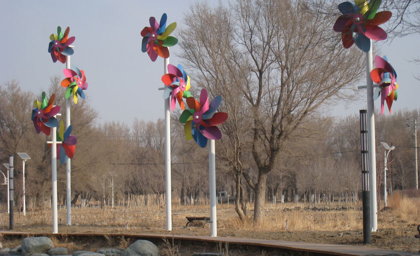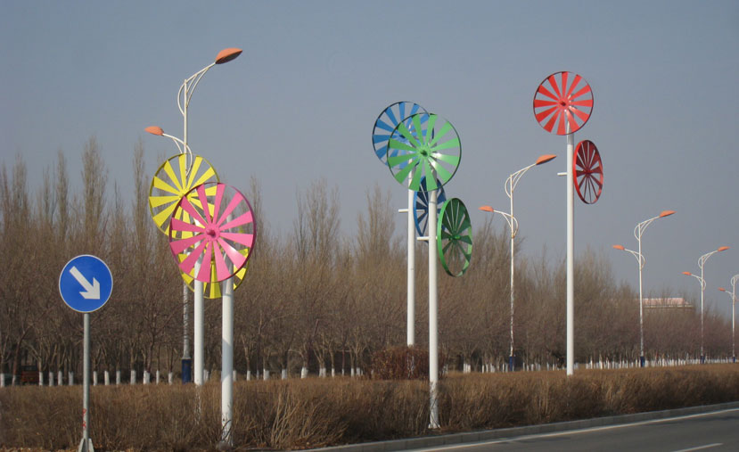 设计理念以风车造型为创作元素,经过设计者的提炼,设计为圆形风车和四叶风车两种。叶片根据风力学进行设计,可随风转动,具有生命力。本项目中共运用了五柱景观风车,安装在达坂城洛宾路。