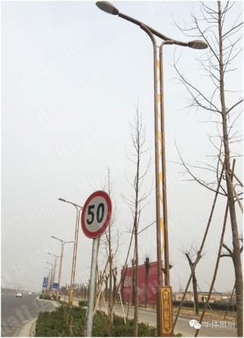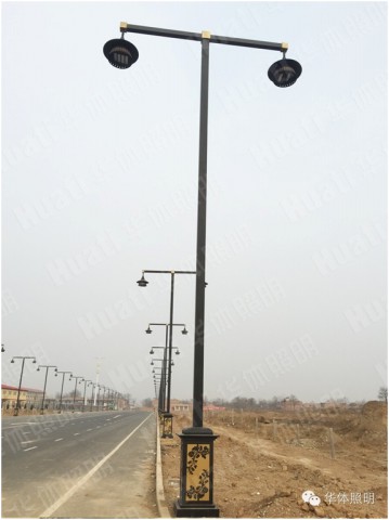 新区内工业大道及幸福大道运用的景观路灯,曲线简洁大方。灯头采用华体专利“和谐”,工业感强,棕色杆体内镂空的金黄色纹理活泼生动,底座加载文化元素—汉仪篆书繁体“渭南新区美丽经开”与“魅力新城 田园都市”字体垂直均匀分布于灯杆底座上。