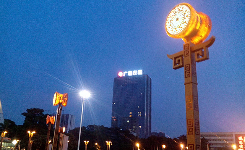 “民族风”、“团结柱”景观灯设计古朴、厚重,既兼顾了广西地域民族特色文化,又体现各民族传承的博大精深,同时与广场周边建筑环境也相得益彰,改善了民族广场的照明条件。彰显了广西各族人民团结奋斗,共同繁荣的社会发展面貌。