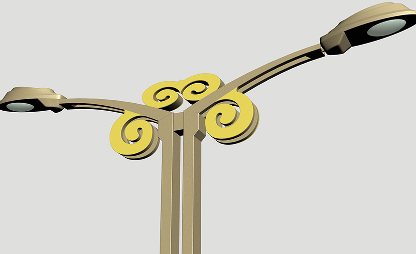 灯型采用汉代“云气图”元素,通过现代的造型结构与中国汉代经典的元素相结合,加入了“云气图”造型,内部加装LED装饰光源,夜幕中通过内透光的形式,勾勒出“云气图”造型的轮廓,使得“祥云之气”简单又具有典型的汉代文化气息。