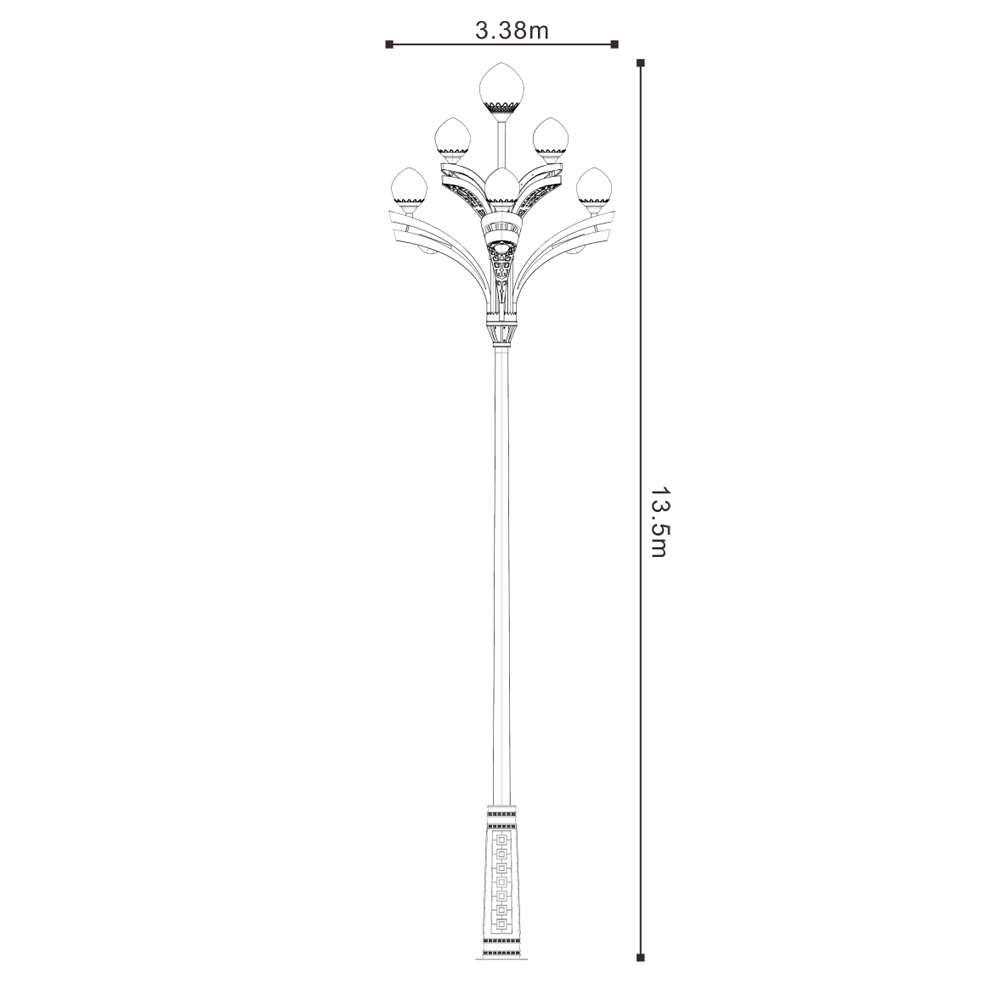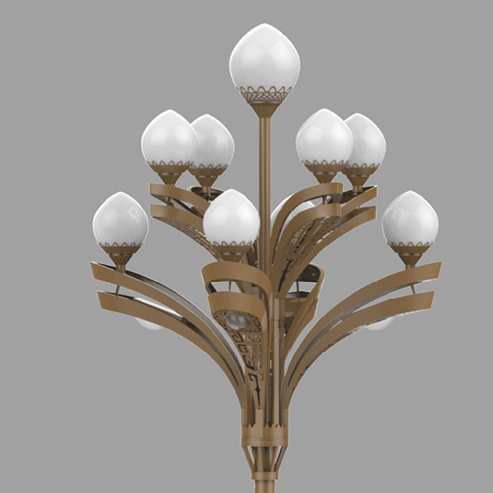 荔枝中华灯的设计是在玉兰灯设计的基础上运用创新思维,将荔枝的形态作为元素,突破传统观念进行设计与开发的一款新型多头道路灯,在外观上实现了厚重与轻秀、传统与现代的完美结合,给人以华丽高贵之感;