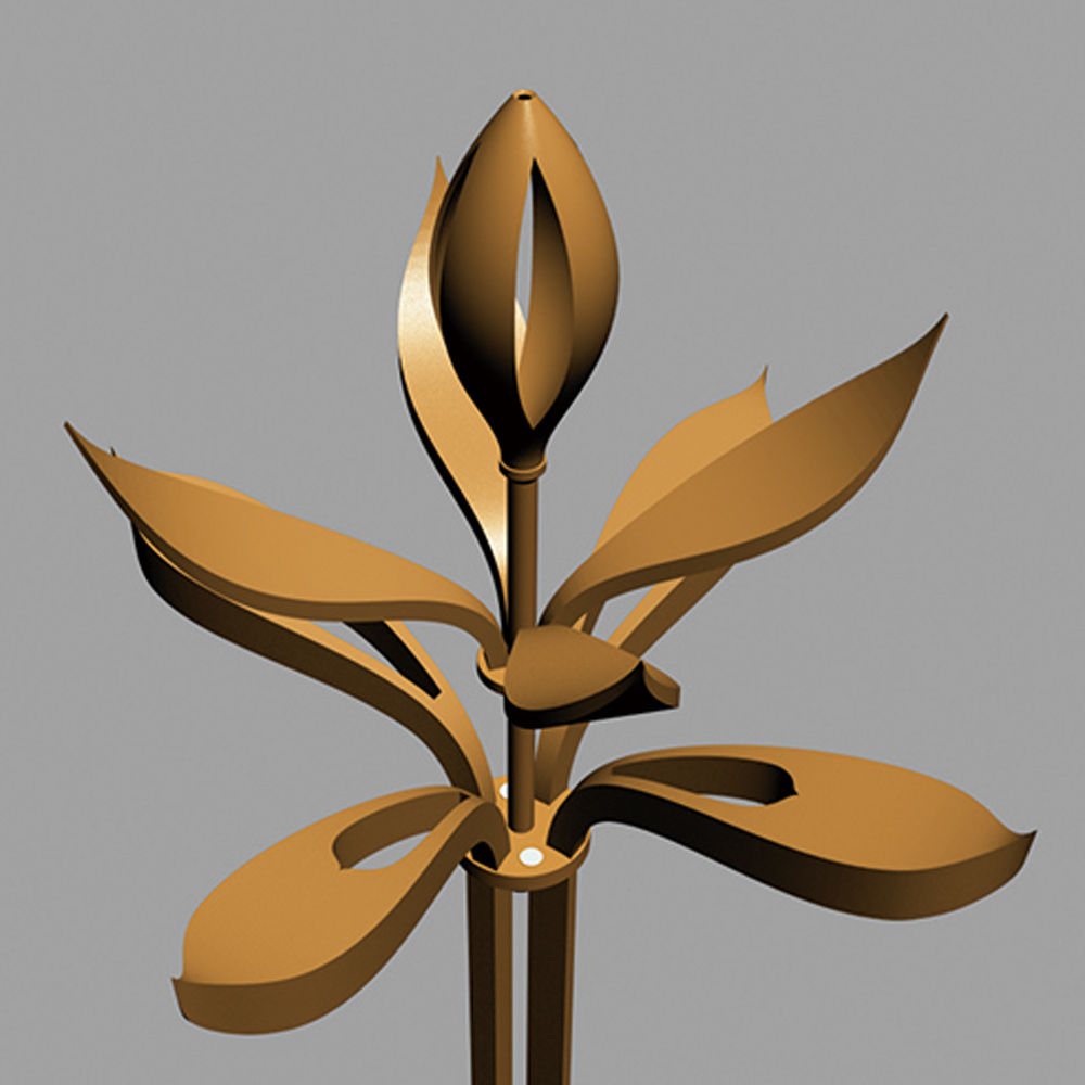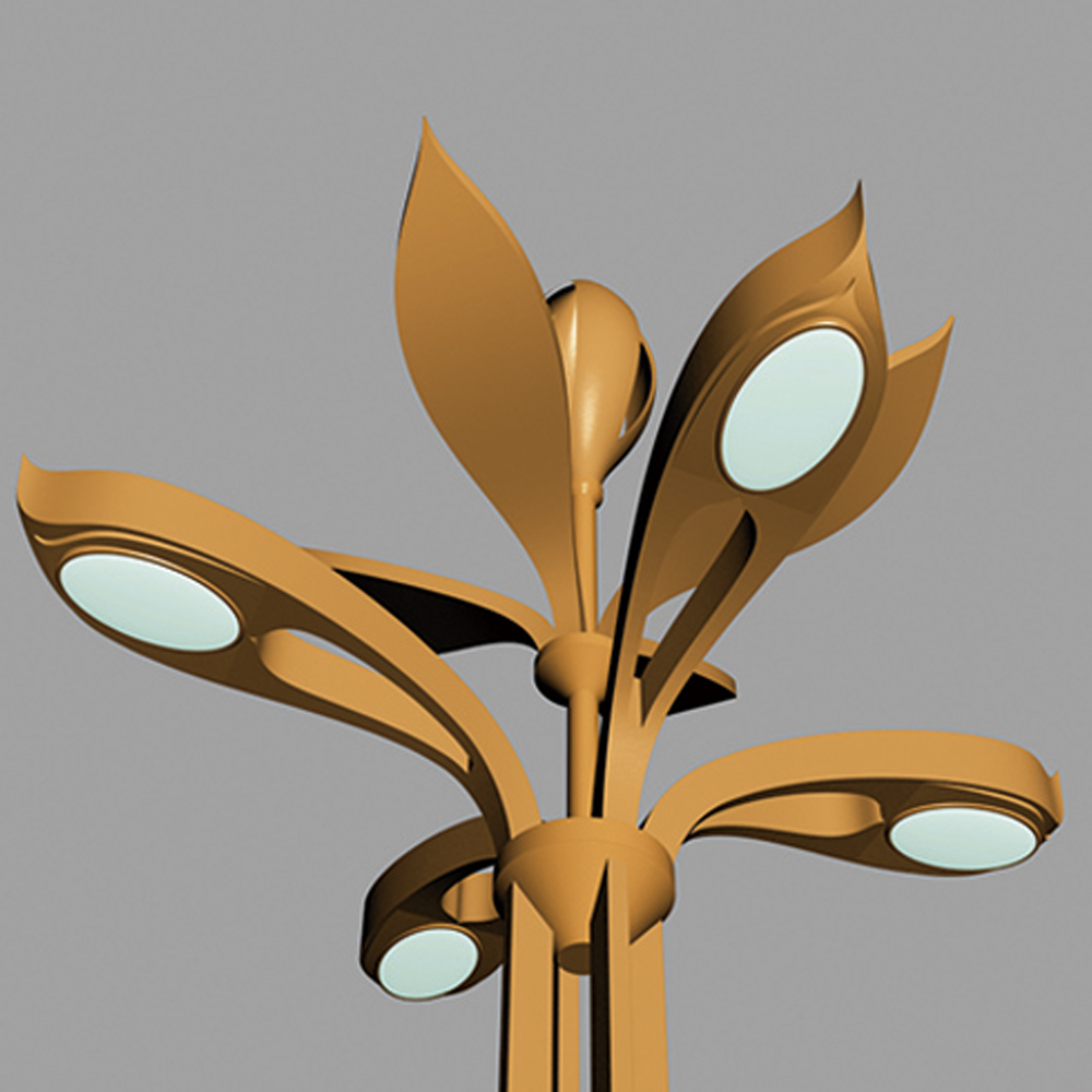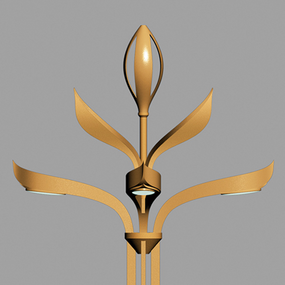 灯具的设计主要通过花卉造型进行抽象设计而来,结合现代工艺转化为集景观与功能照明为一体的户外照明工具;