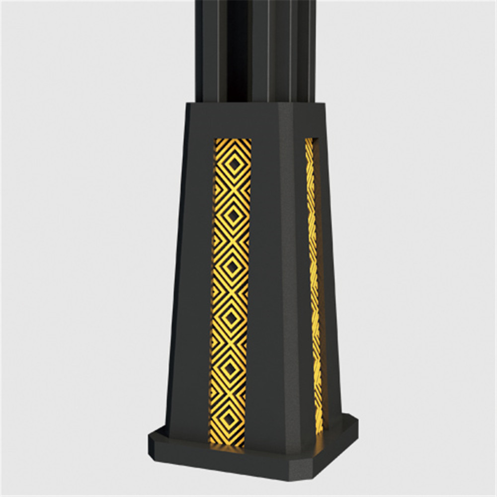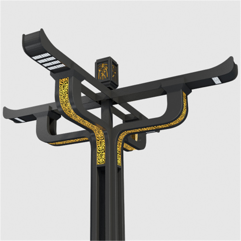 设计以秦汉建筑为元素,取秦代崇尚的黑色为主色调,灯臂装饰以秦代纹饰,造型则提取自汉斗、汉阙。线条流畅、简练,四向对称的造型庄重大气。