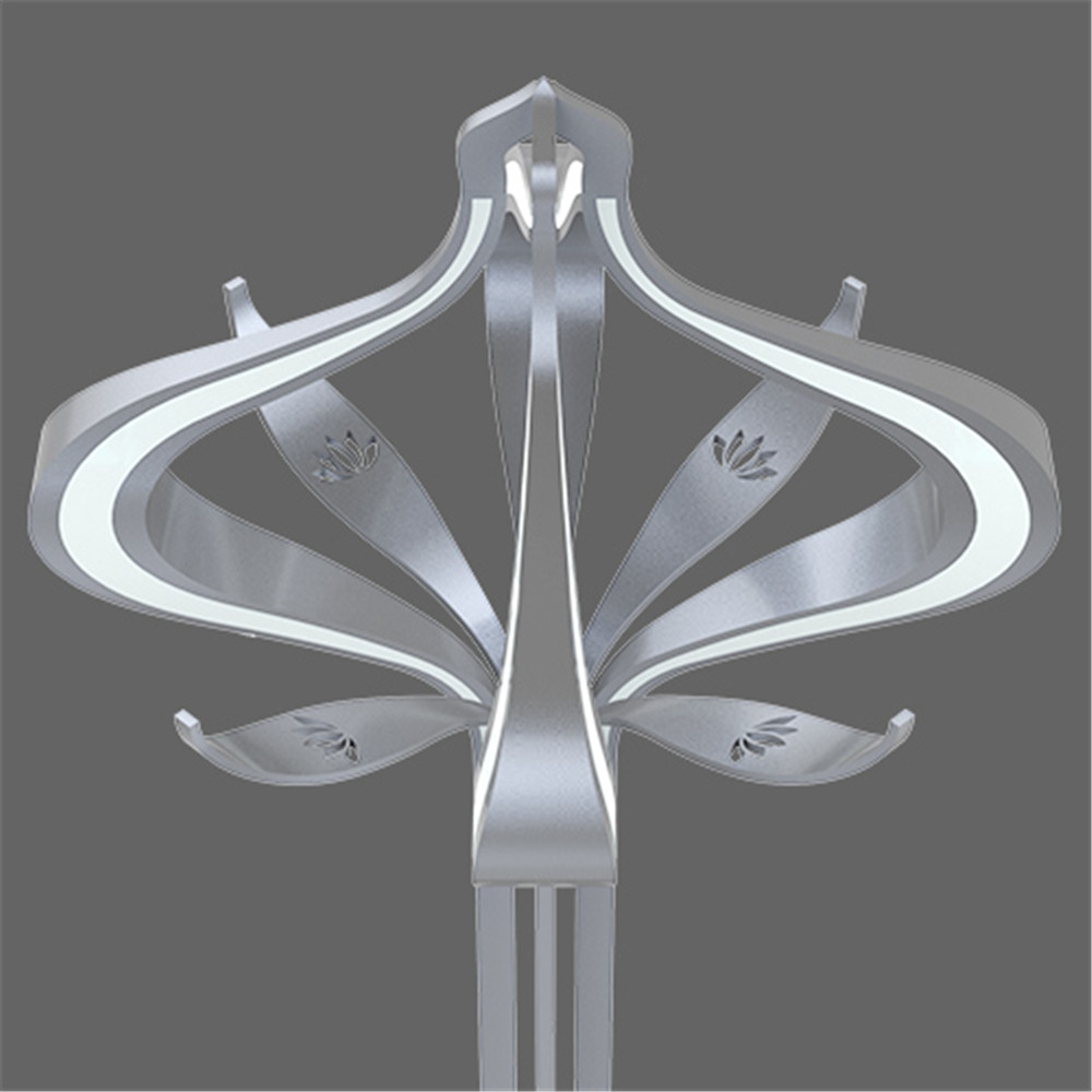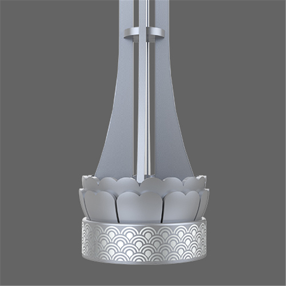 现代的莲花抽象成佛教金刚杵的形态,内敛棚合的造型是双手合十的禅意,前卫而充满佛性,精致脱俗的莲花水纹底座诠释莲花的出淤泥而不染;