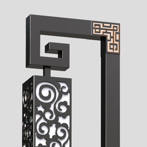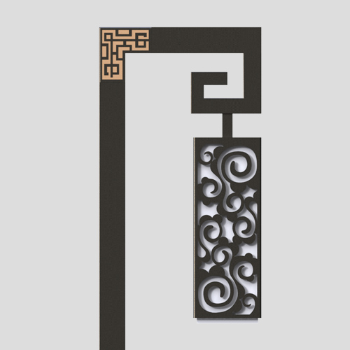 灯型材质以优质钢材与木纹漆为主,整体灯型采用现代的设计手法,融入传统窗花和祥云元素,灯型整体简洁、现代。